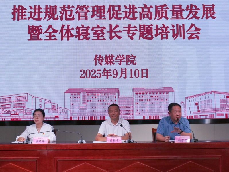 为加强学生骨干队伍建设,营造寝室文明氛围,9月10日下午,传媒学院于崇德楼报告厅召开推进规范管理促进高质量发展暨全院寝室长专题培训会。传媒学院党总支书记刘长华、副书记张雷雷,学生管理办公室主任陈伟伟,以及学生会生活部长、学院各班级生活委员、寝室长出席会议。会议由陈伟伟主持。