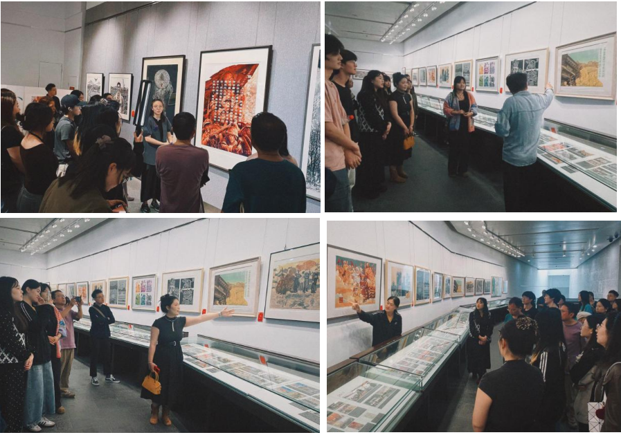 开展当天,美术学院版画方向师生赴现场观摩学习。观展前,安徽省美协版画艺术委员会主任、我校客座教授师晶首先介绍了本次展览的整体情况。随后,美术学院教师张婷婷对部分作品进行了专业导赏。在互动环节中,部分参展艺术家们从创作理念、技法运用、情感表达等维度,深入解读了自己作品背后的艺术思考,与我院师生围绕主题性版画的创作实践展开了交流与分享,通过思想碰撞进一步拓展了艺术视野。