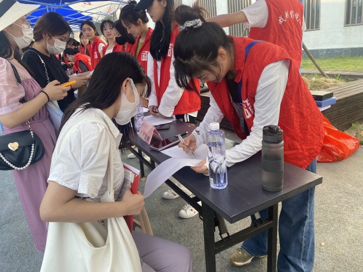 当日,有的学生干部坐在室外临时搭建的棚子下面,耐心指导着每一位同学办理着相应的入学手续。另一部分学生干部则顶着烈日,把新生们一个个的引领到戏剧影视系的报道处,待新生入学流程完成后,再帮助他们拖运行李至宿舍。部分同学因担心人手不足,也自愿加入到了此项志愿活动中。