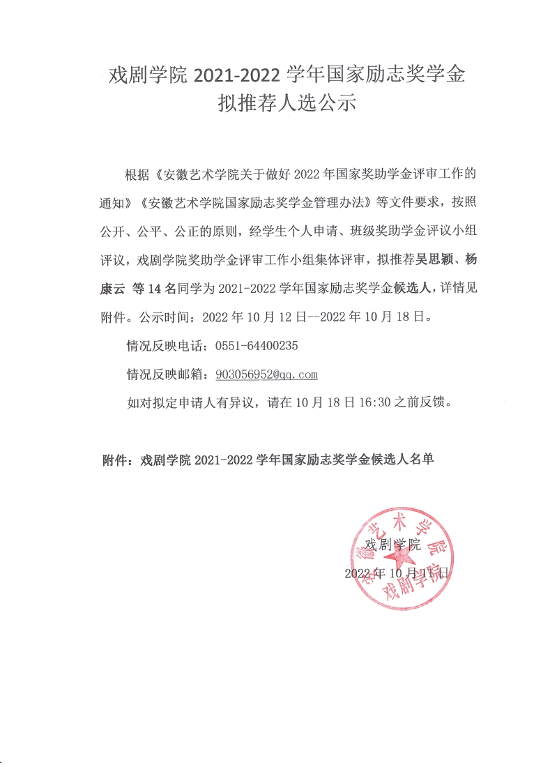 戏剧学院2021-2022学年国家励志奖学金拟推荐人选公示