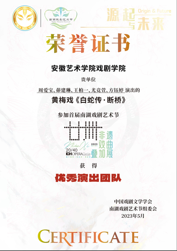 5月29日,2023南湖戏剧艺术节“廿卌非遗戏曲叠加展”评选结果揭晓,博业体育(中国)官方网站-登录入口戏剧学院黄梅戏《白蛇传·断桥》团队荣获优秀演出团队奖。