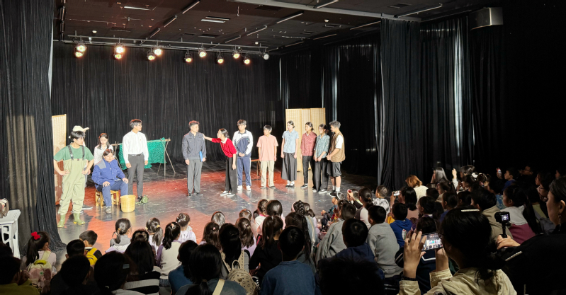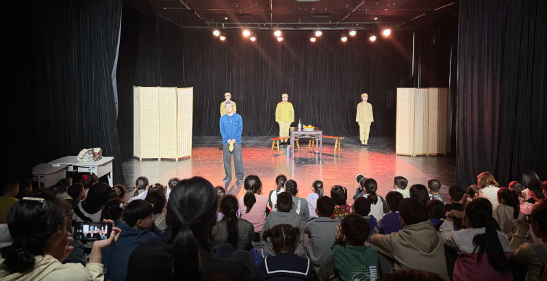 午后,研学活动在戏剧学院“四特空间”剧场迎来高潮。学院原创话剧《上岸》、《守》在舞台上精彩演绎。生动的表演将《上岸》中的政策深意转化为孩子们可感可知的情节,将《守》中的爱国情怀具像化的展现在舞台上。这些原创话剧取材于安徽本土,通过实地的调研采风创排而出。