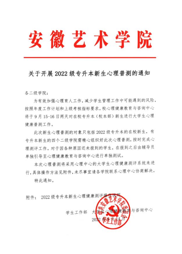 关于开展2022级专升本新生心理普测的通知