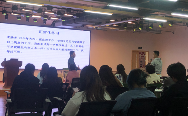 活动由危机的征兆、综合干预、危机的筛查和常用技术演练几部分组成。何元庆教授用生动的案例向在场的老师和同学科普了青少年常见的心理和精神问题,用视频方式介绍了双相情感障碍等心理疾病的症状特征。在谈到自残和自杀行为部分的时候,何教授分析了自残背后有证明自己存在的动机,随后何教授又分析了强迫、适应障碍、身心问题等方面的知识。