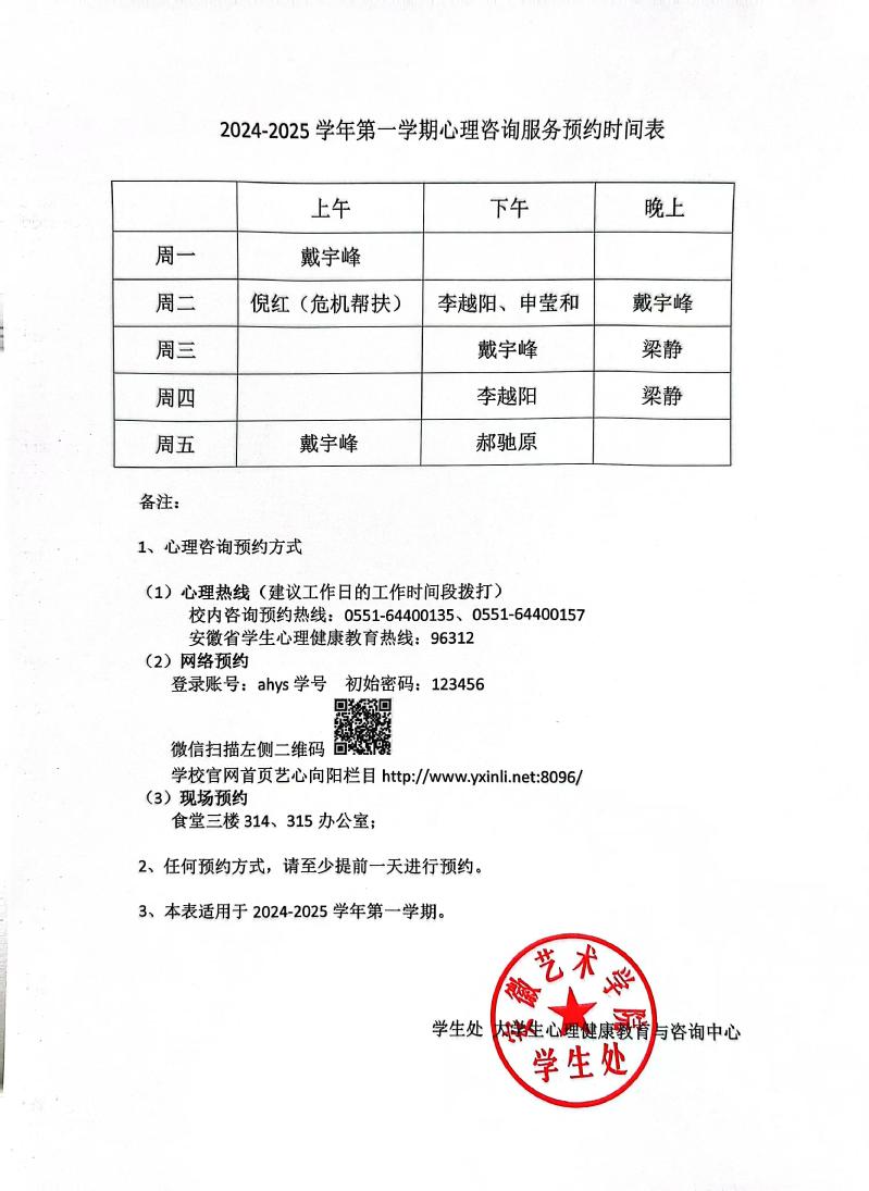 2024-2025 学年第一学期心理咨询服务预约时间表