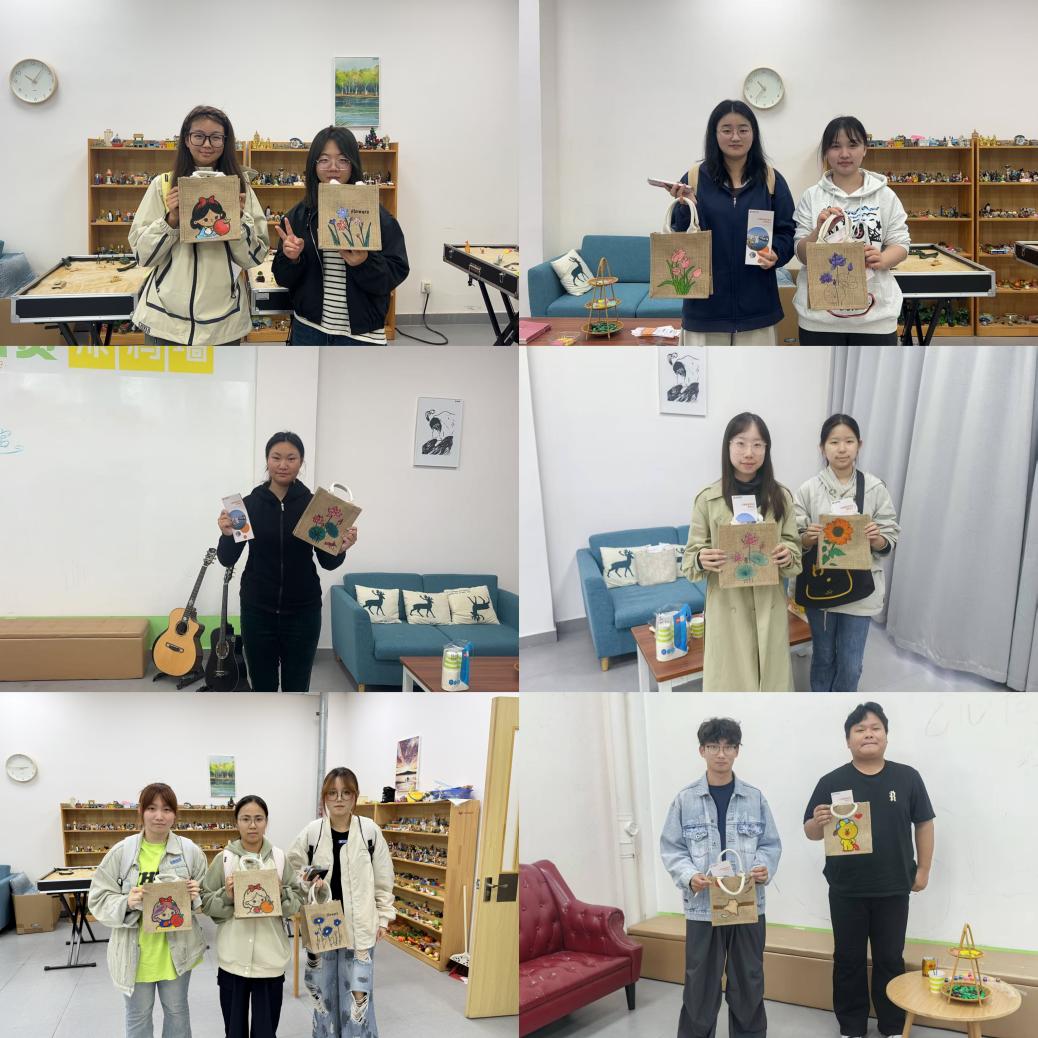 在手工彩绘活动现场,同学们充分发挥艺术创意,在麻布包上勾勒出一个个鲜活的画面。有的同学绘制出可爱的卡通人物,让童趣与创意在布包上绽放;有的同学以烂漫的花卉为主题,用斑斓色彩晕染出自然之美;还有的同学创作了充满个性的艺术图案,将自我表达融入每一笔线条。完成创作后,同学们手捧专属的彩绘布包合影留念,这些亲手制作的作品不仅是艺术的成果,更是心灵疗愈的载体,让大家在创作中释放情绪、收获成就感。