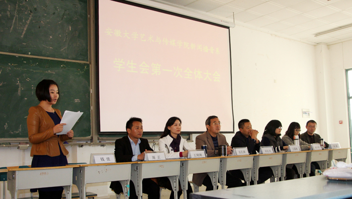 大会在老师及同学们热烈的掌声中拉开帷幕。钱佳老师首先介绍了学生会的情况。之后,系学生管理秘书刘涛老师宣读了第一届学生会干部名单。随后学生会代表李金邦带领学生会全体成员进行庄严的宣誓,表达了他们愿意以身作则、团结协作、遵守校规、服务全系的决心,愿意为安徽大学艺术与传媒学院的发展而贡献自己的力量。
