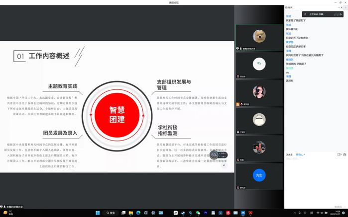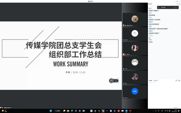 2022年12月21日,传媒学院团总支书记于博文同传媒学院团总支学生会主席团成员、学生副书记、各部门部长,在线上进行了传媒学院学生会干部年度考核会。