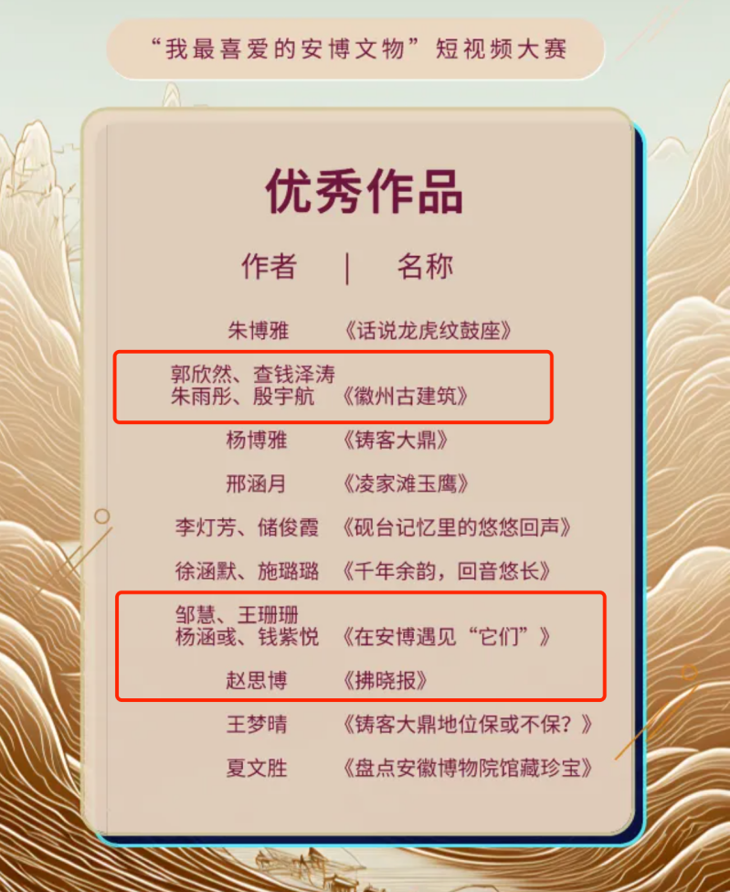 近日,我院新闻学专业学子的两组作品《徽州古建筑》《在安博遇见“它们”》在“我最喜欢的安博文物”短视频大赛中被评为优秀作品。