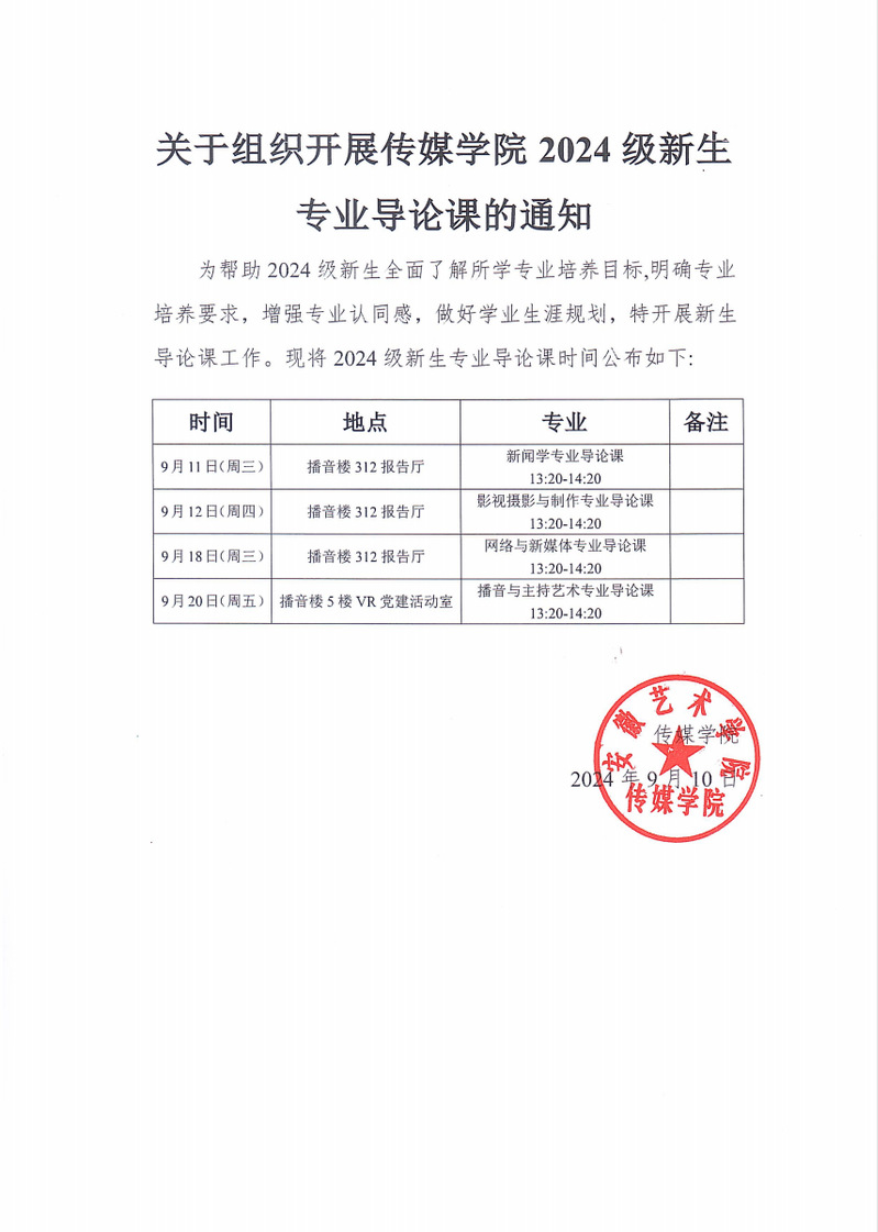 关于组织开展传媒学院2024级新生专业导论课的通知