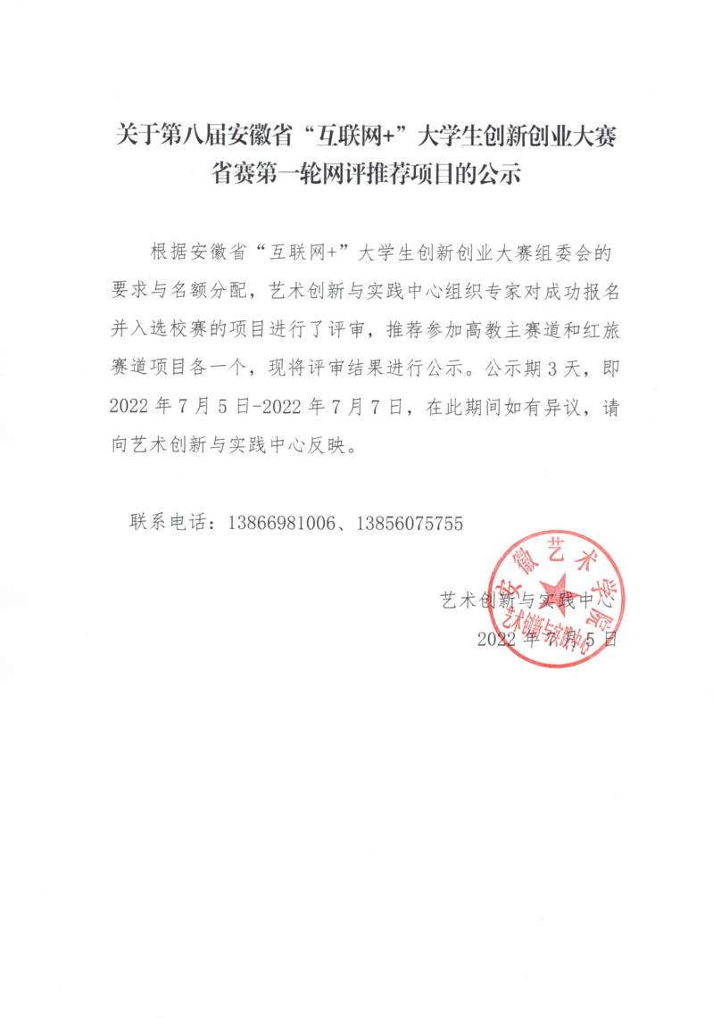 关于第八届安徽省“互联网+”大学生创新创业大赛 省赛第一轮网评推荐项目的公示
