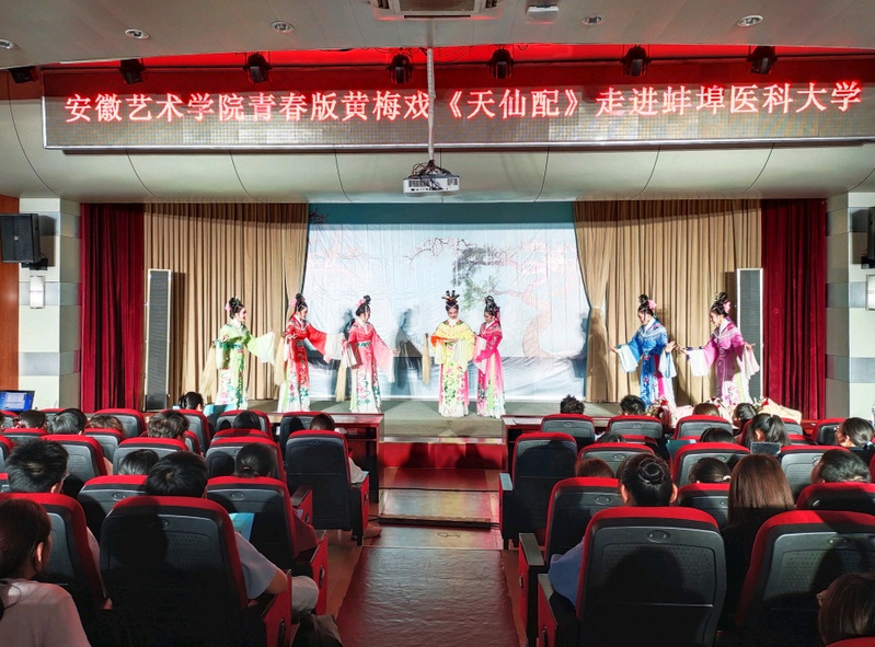5月27日下午,我校戏剧学院青春实验剧团孵化传统戏曲复排项目黄梅戏青春版《天仙配》在蚌埠医科大学学术报告厅演出,现场200余名师生观看了演出。这次演出由博业体育(中国)官方网站-登录入口和蚌埠医科大学联合主办,是我校优质文艺创作作品走出校园、扩大交流、服务社会的重要活动.