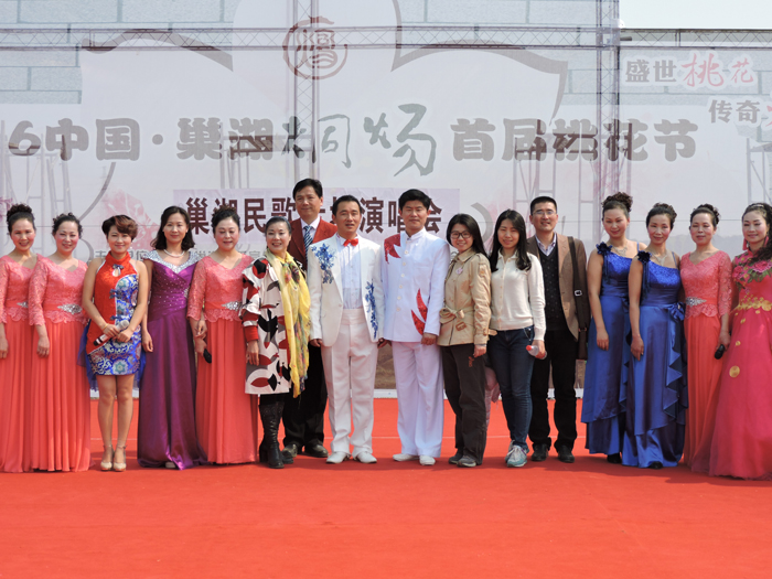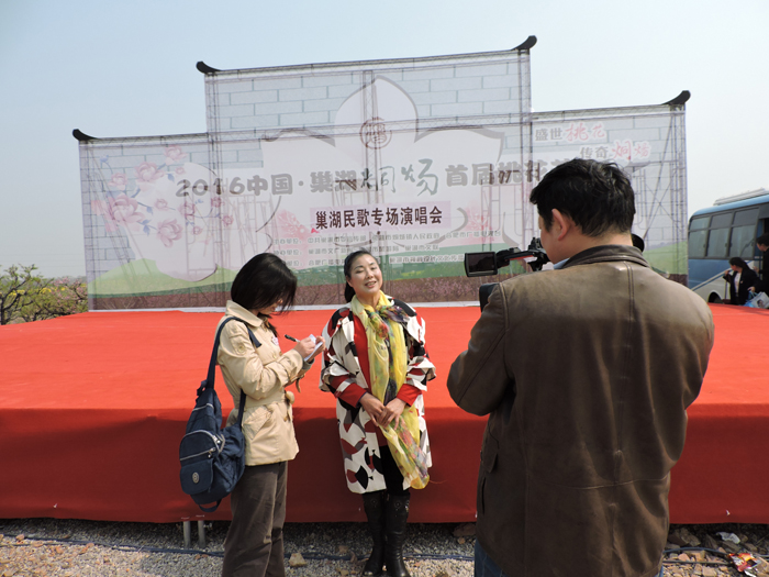 一大早,采风团驱车来到烔炀镇,观看并录制了“2016中国·巢湖烔炀首届桃花节·巢湖民歌专场演唱会”。演唱会后,采风团和巢湖民歌研究会理事、本次演唱会的策划袁明方女士,巢湖民歌研究会副会长、巢湖民歌传承人李家莲女士,以及近年来活跃在舞台上的中青年巢湖民歌手进行了交流。