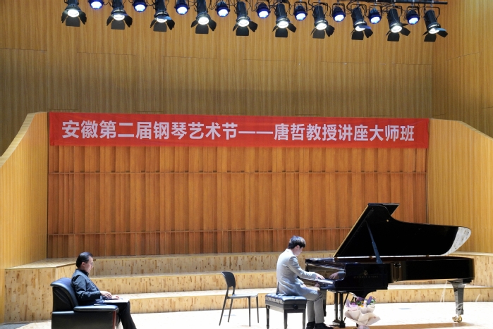 聘任仪式后,唐哲为我校师生上了一堂生动的大师课。对四位登台演奏的同学,唐哲用形象的比喻、生动的讲解,缓解同学的紧张,解决演奏的不足。唐哲从情感、韵律、平衡等方面对作品进行细致分析,对同学们平时易忽视的小细节以及在段落转接等方面出现的问题一一指导、纠正。