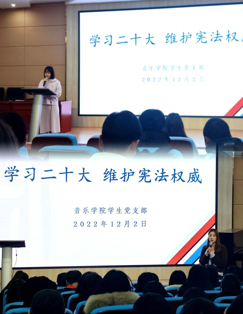 为深入学习宣传宪法,大力弘扬社会主义法治精神、维护宪法权威,音乐学院学生学生党支部于12月2日在音乐南楼报告厅召开支部党员大会,开展“学习二十大、维护宪法权威”的专题学习探讨会。本次会议由第一学生支部书记胡曦雯张珂主持,第一、第二学生支部全体党员及马克思主义理论学习小组全体成员参加。