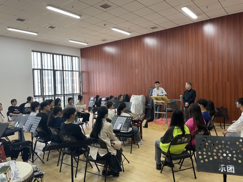 9月20 日下午,在音乐南楼303国乐团排练厅举行国乐团新聘团员见面会,音乐学院党总支书记、院长李伟,国乐教研室主任朱泽军,乐团指挥教师闫奇参加本次见面会。