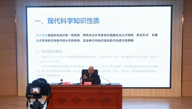 讲座内容从“现代科学知识性质”“后现代文化知识性质”“音乐教育挑战”“ 基于后现代知识观的音乐教学转向”四点为主体框架,逐步阐述了当代知识观转型的发生背景、基本理念和挑战,客观分析了音乐教育改革的必要性、主要内容和实施方式。朱玉江以独特的视角,旁征博引,从学理层面系统地为我院教师作深入讲解。