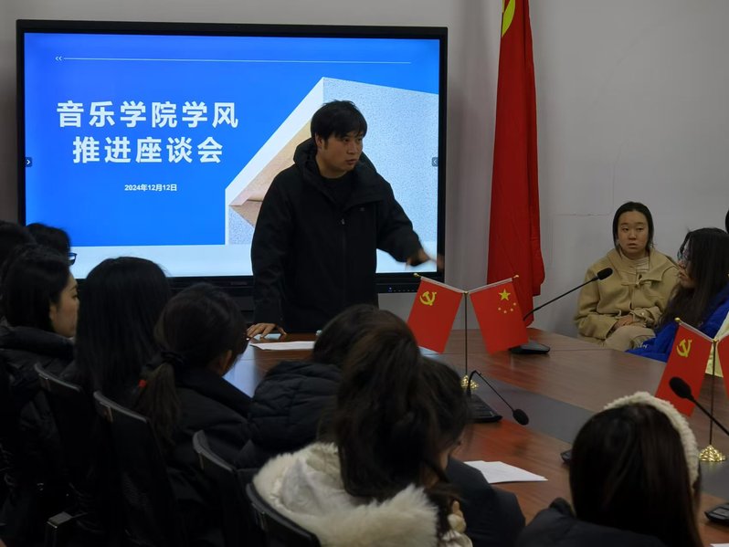 为推进学风建设,让学生深入了解学院教学模式及管理服务,进一步为学生提供更好的学习指导,音乐学院于2024年12月12日,在音乐南楼104会议室召开学风推进座谈会。学院党总支副书记李传兴出席会议。