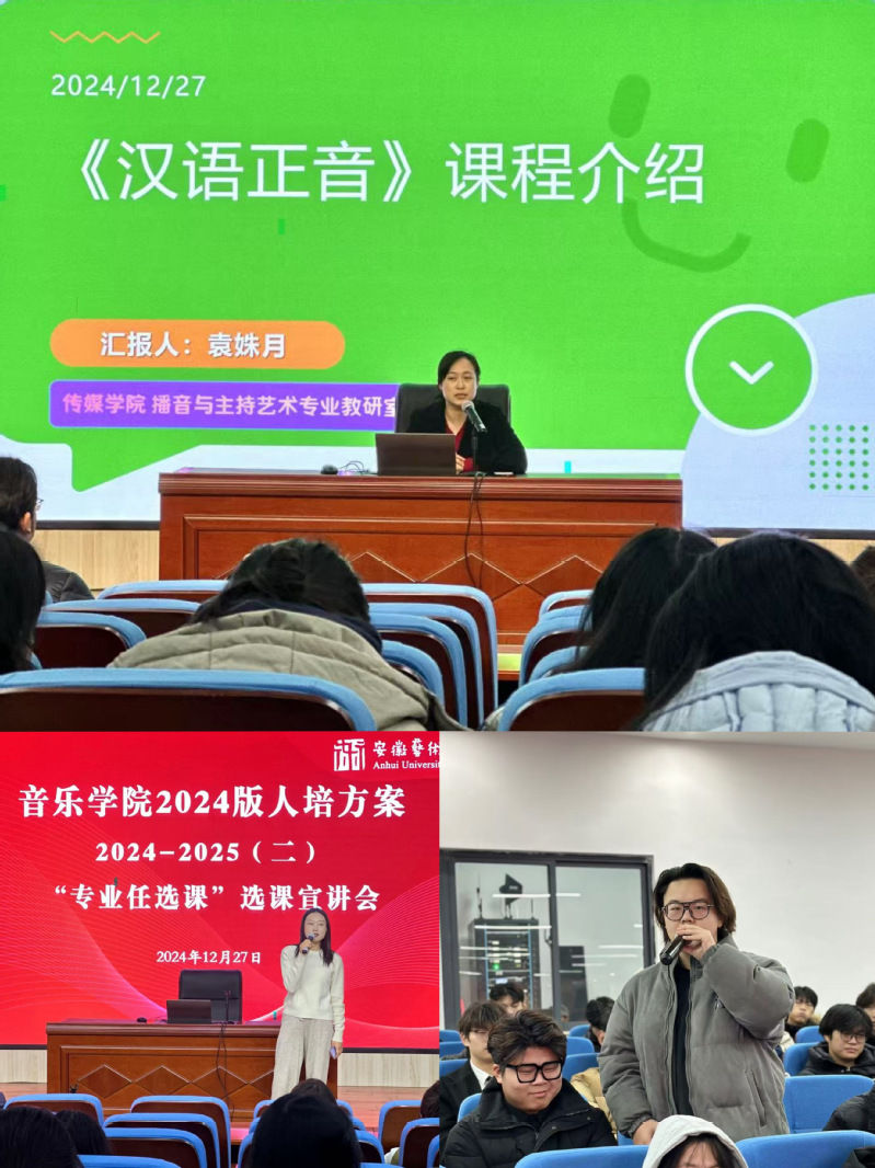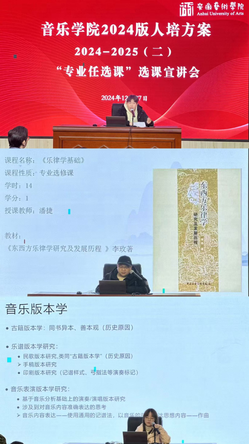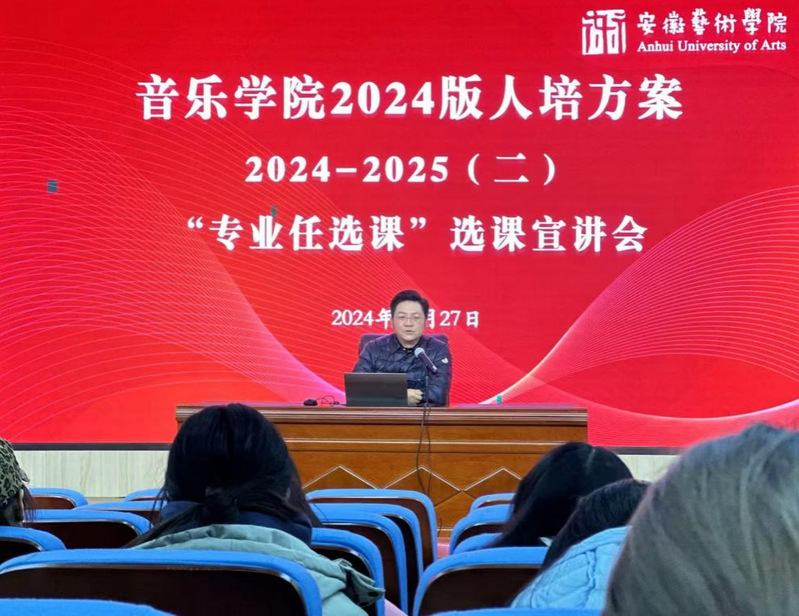 12月27日12:30,音乐学院南楼报告厅成功召开2024版人培方案2024-2025学年(第二学期)“专业任选课”选课宣讲会。此次会议由教学副院长张祖顺主持,教学科研办公室负责人、专业任选课课程教师共同参会。