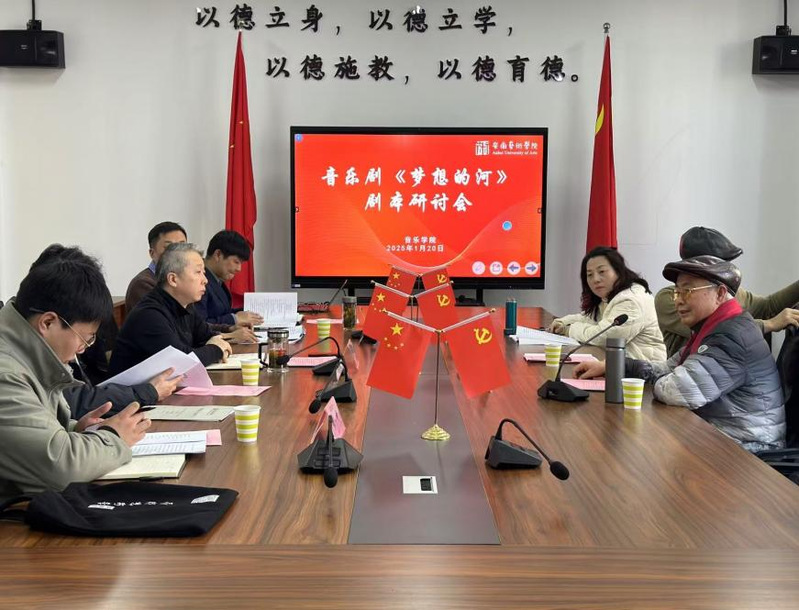 1月20日14:30,音乐学院在南楼104会议室组织开展音乐剧《梦想的河》剧本研讨会。三位外请专家:安徽省文联原副主席,安徽省戏剧家协会原主席,一级编剧王长安,安徽省演出总公司原总经理、国家一级导演沈晓梅以及国家一级导演李义田出席。我校戏剧学院沈后庆教授、姚爽博士以及音乐剧作曲张中灿、导演李申参加。会议由音乐学院党总支书记、院长李伟主持。