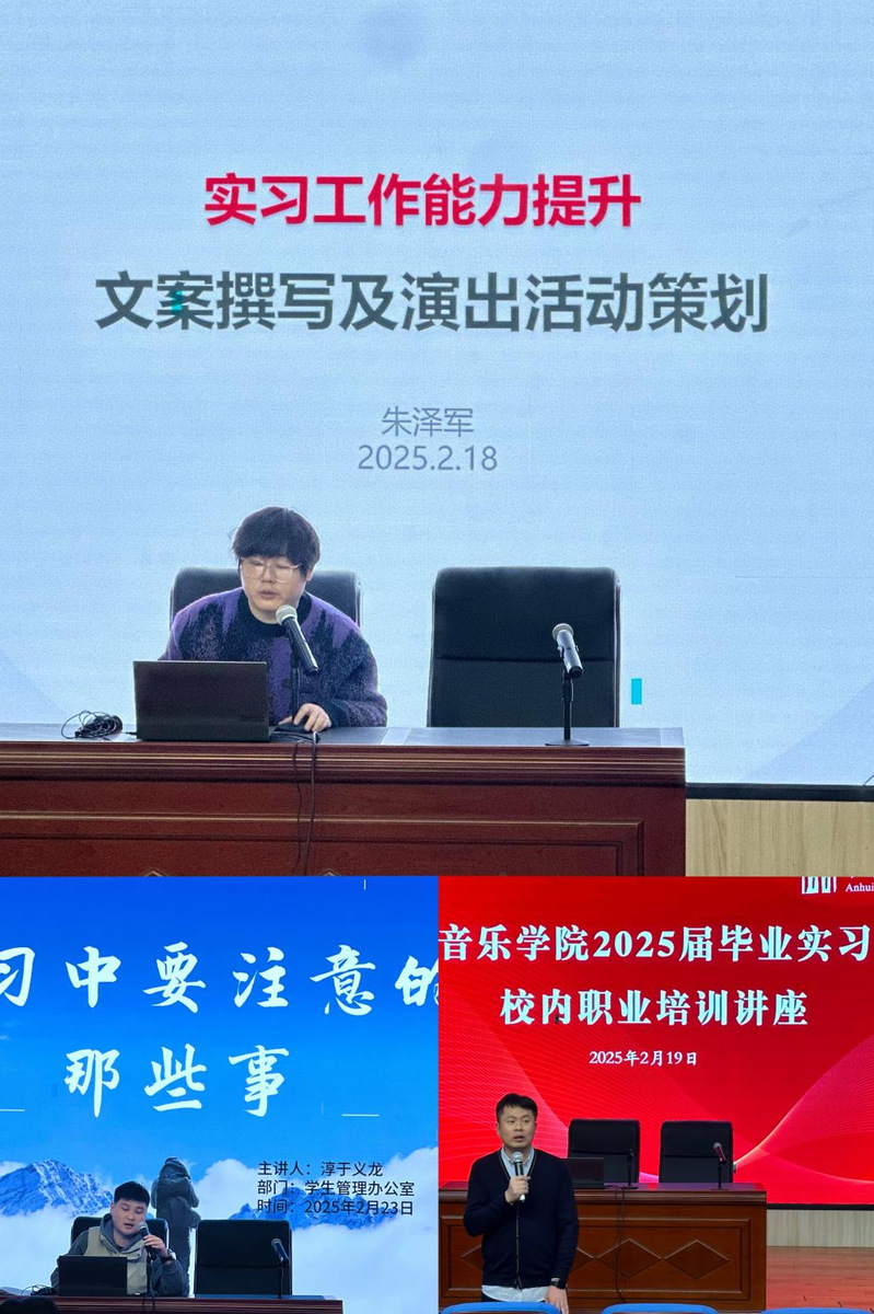 本届音乐学院毕业实习校内培训讲座历时两周,由校内外教师联合授课。内容涵盖职场基础技能、行业趋势分析及职业素养培养。全方位提升毕业生职业竞争力,助力学生掌握专业知识,明确实习目标,增强实习信心。