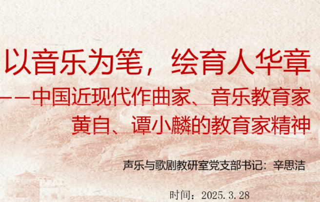为深入学习和弘扬教育家精神,助力音乐教育事业高质量发展,声乐与歌剧教研室党支部于2024年12月30日和2025年3月28日,先后组织开展两场“教育家精神”党课,声歌教研室党支部书记辛思洁主讲,教研室全体党员共同参与学习。