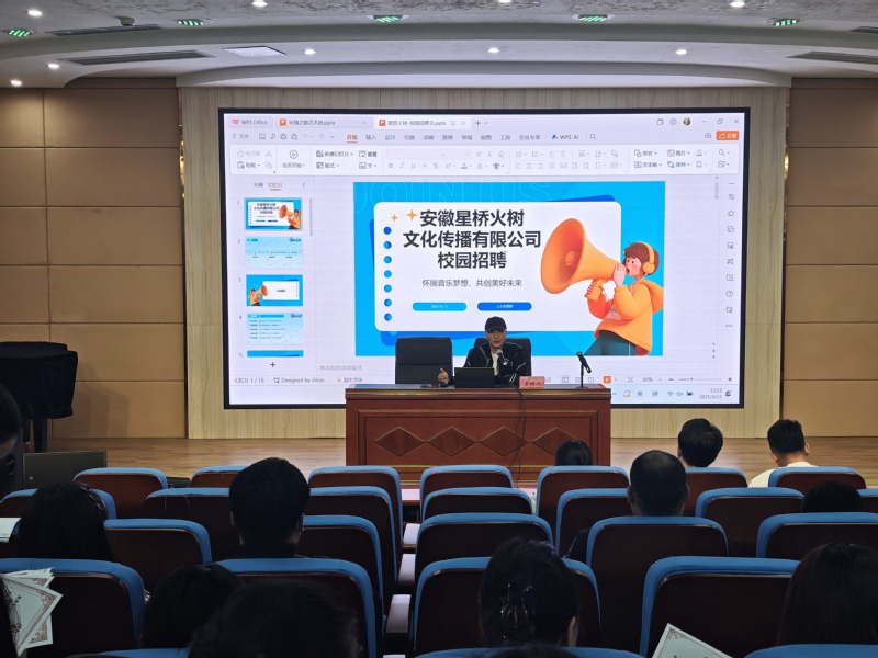 4月15日下午,音乐学院在音乐南楼报告厅成功举办2025年春季专场就业招聘会。本次招聘会邀请到安徽星桥火树文化传播有限公司、宁波丝绸之路艺术团和迎驾集团三家优质企业到场,为学院毕业生提供多元化的就业机会。