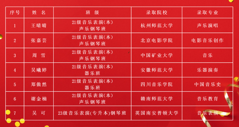 近日,2025年全国硕士研究生招生考试录取结果陆续揭晓,我院学子捷报频传。截至发稿时,音乐学院共有7名优秀毕业生凭借扎实的专业功底和优异的综合素质,成功考取国内外知名高校及艺术院校硕士研究生,录取院校涵盖四川音乐学院、杭州师范大学等高水平学府(具体名单附后)。这一成绩充分彰显了我院分层分类人才培养成效。