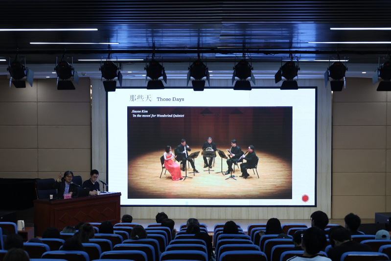 金教授以木管五重奏《在月球》和伽倻琴与大琴弦乐团《旻河》为例,深入浅出地讲解了非调性与调性在音乐创作中的协调处理。他详细解读了《在月球》中各乐器声部的音色搭配与和声运用,以及《旻河》中传统与现代音乐元素的融合,分享了自己在创作中的思考与探索。在互动环节,金教授耐心解答同学们关于创作灵感、素材积累及技术处理的问题,给予诸多建议。