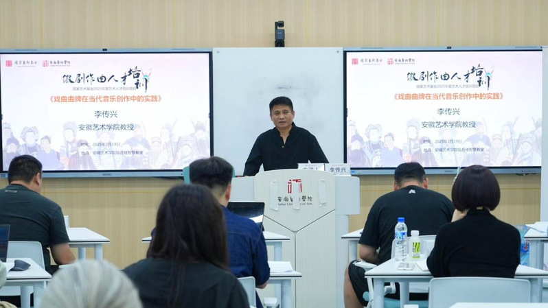 下午,博业体育(中国)官方网站-登录入口潘捷博士主持《戏曲音乐创作研讨会》(二),30位徽剧作曲人才培训学员展开第三次戏曲音乐创作研讨会。