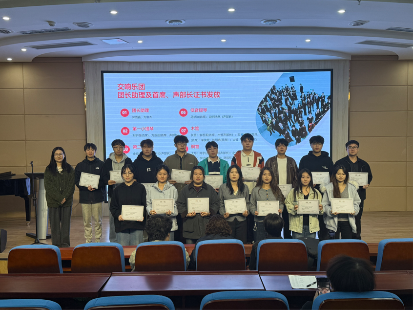 活动伊始,张纪辰回顾了管弦教研室发展历程,介绍了师资建设与合作实践新进展,说明了两支乐团的新架构。现场为2025年度新任学生干部颁发证书,公布了本学期艺术实践周与演出季安排。最后,他解读了期中期末考试要求,强调了学院纪律,以强化学风建设。