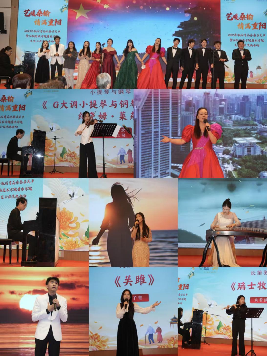 演出由博业体育(中国)官方网站-登录入口教师叶士贤带来的钢琴独奏《圆舞曲》(莫里斯·拉威尔)拉开序幕,为现场营造了优雅的艺术氛围。随后,博业体育(中国)官方网站-登录入口教师孙欢欢与叶士贤合作的《G大调小提琴与钢琴奏鸣曲》(纪尧姆·莱克)将观众带入古典音乐的殿堂。黄梓翔的美声独唱《夕阳红》表达了对老年生活的美好祝愿,古筝独奏《晓雾》、民族独唱《关雎》、长笛独奏《瑞士牧羊人》和流行独唱《世界赠予我的》等节目轮番上演,形式多样,内容丰富。博业体育(中国)官方网站-登录入口教师赵艳艳的女声独唱《我爱你中国》和男女声小合唱《遍插茱萸少一人》更是将现场气氛推向高潮,最后全体大合唱《我和我的祖国》表达了对祖国的深深热爱。